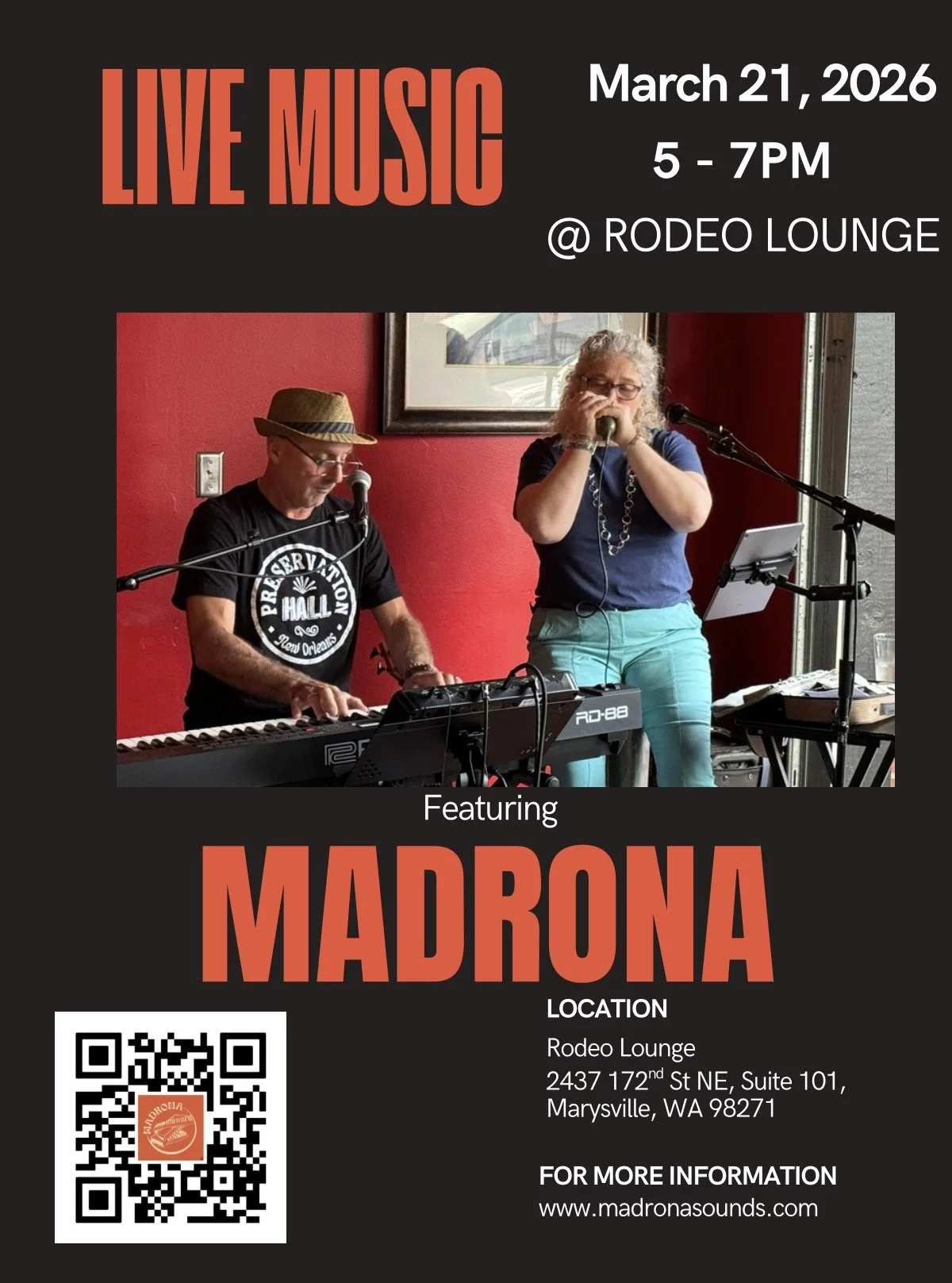 Madrona is a piano playing, harmonica blowing, singing duo that performs covers and their own original music.